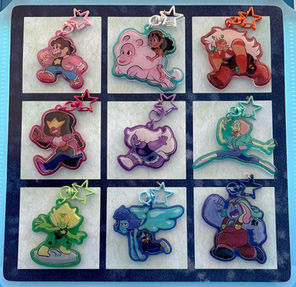 Various acrylic charms I've designed. The original artwork was painted in analogue watercolor.